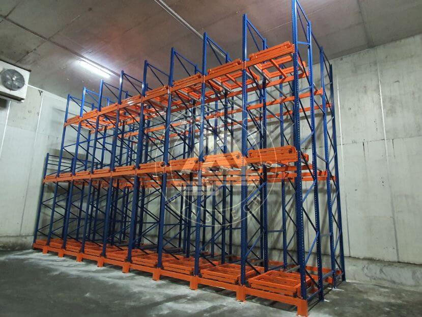 Push back racking is a first-in-last-out (FILO) storage system designed for unitary palletized goods.